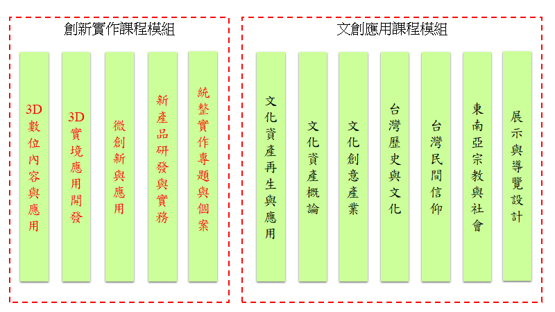 | 文創應用課程 模組 | 文化資產再生與創意應用 | 3 | 微學程至少選一門 完整學程至少選二門 |